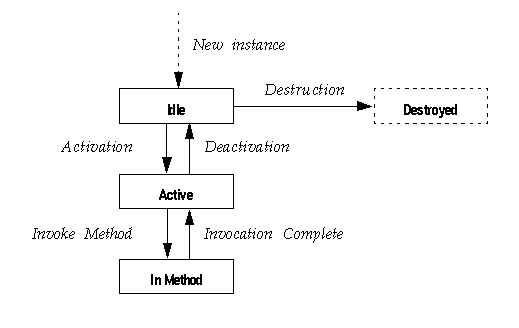 New instance – The EAServer runtime allocates a new instance of the component class. The default constructor is called if one exists. The instance remains idle until the first method invocation.